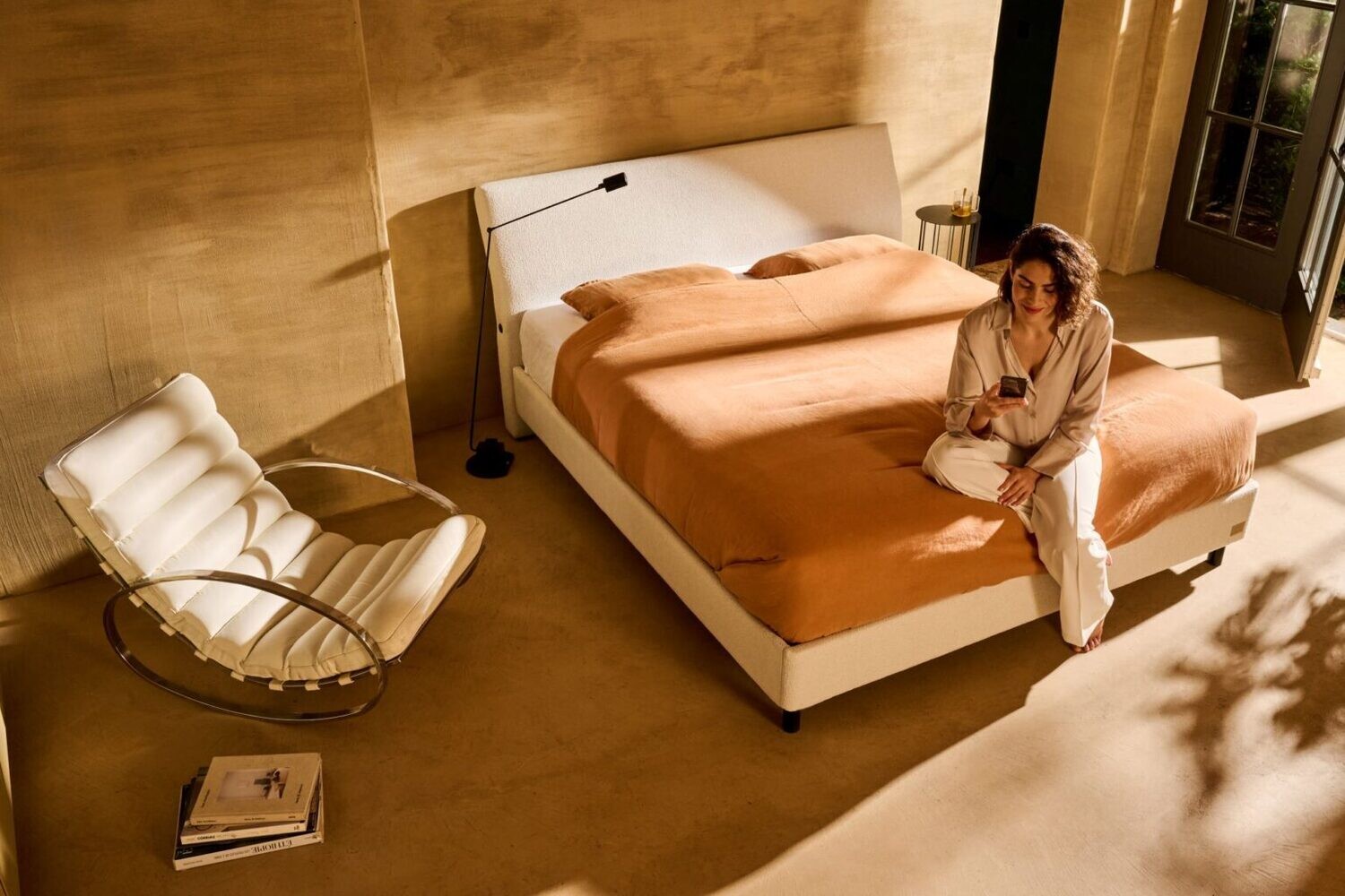 3-zijdig gestoffeerde bedkader, met hoofdbord Ivy. Trendy gebogen hoofdbord met USB aansluiting. Het hoofdbord is gestoffeerd aan achterzijde waardoor het geen probleem vormt om deze bedkader in het midden van de ruimte te plaatsen.