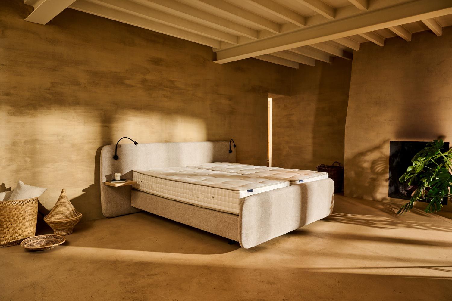 De boxspring Lotus heeft een opvallend en modern ontwerp dat elegantie uitstraalt in je slaapkamer. Het hoofdeinde is prominent aanwezig, met een gestroomlijnd en rond ontwerp dat zorgt voor een zachte en uitnodigende uitstraling. Indien gewenst kan het hoofdeinde met een plankje als nachtkastje, wat praktisch is voor het plaatsen van bijvoorbeeld een boek of glas water.